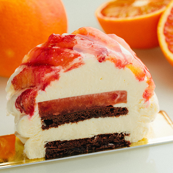 宇和島市・児玉農園のブラッドオレンジを使用。甘さをおさえたホワイトチョコレートのムースにより、香り高いゼリーの風味が際立つ仕上がりに。