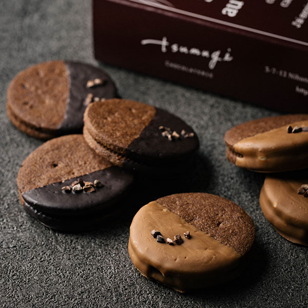 ザクっと食感のカカオ生地のクッキーにビターとミルクのチョコレートを挟み、コーティング。