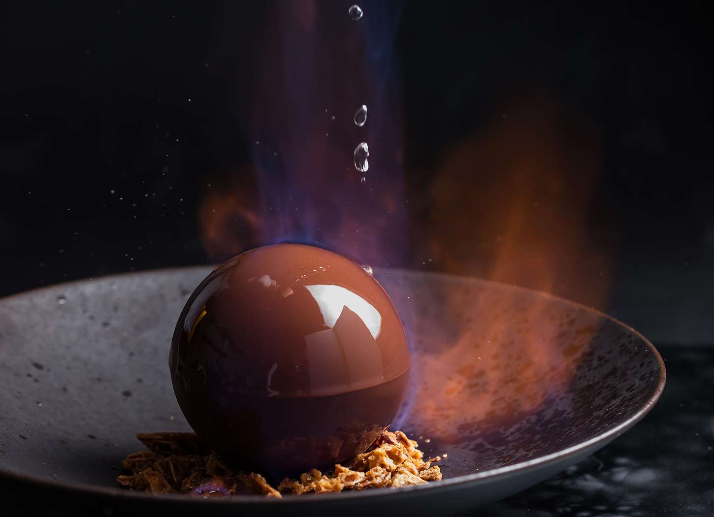 フランス語で「驚き」を意味する名前を冠したデセール。お客様の目の前で、球状のチョコレートをフランベして溶かし崩します。