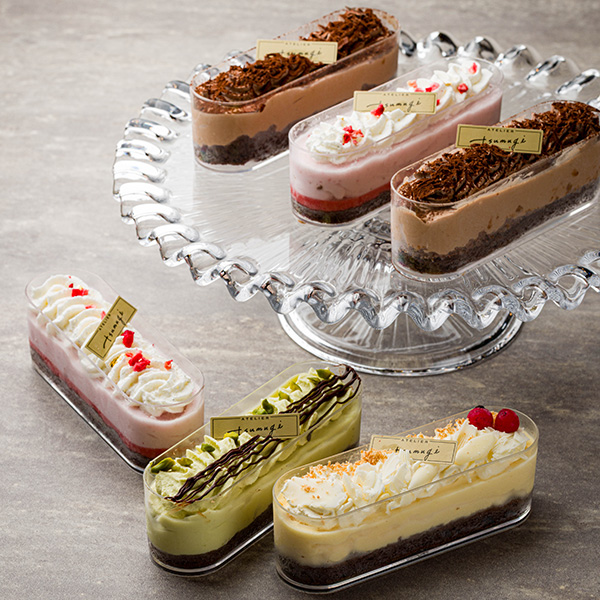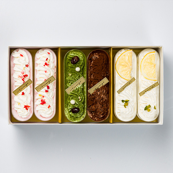 季節スイーツなど ジェラート カップケーキ ジェラートと生クリーム&カスタードのセミフレッドスポンジを2層に重ね、ショートケーキのようにデコレーション。ガトーフレーズ、シトロン、テヴェール、ショコラオランジュの4種をご用意しました。 PREV NEXT