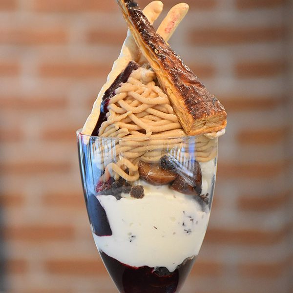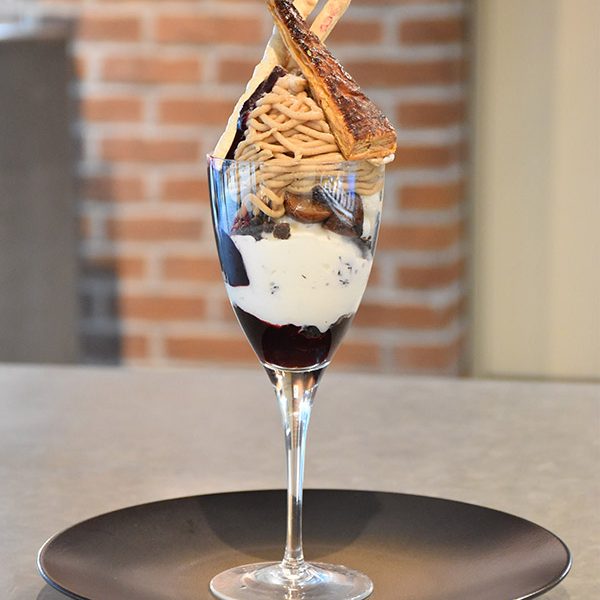 季節スイーツ パルフェ カシスマロン 愛媛県産の和栗を使用したやさしい甘さのクリームと、酸味のあるカシスのコンフィチュールを合わせました。グランマニエ(オレンジ・リキュール)のジェラートがアクセント。 PREV NEXT