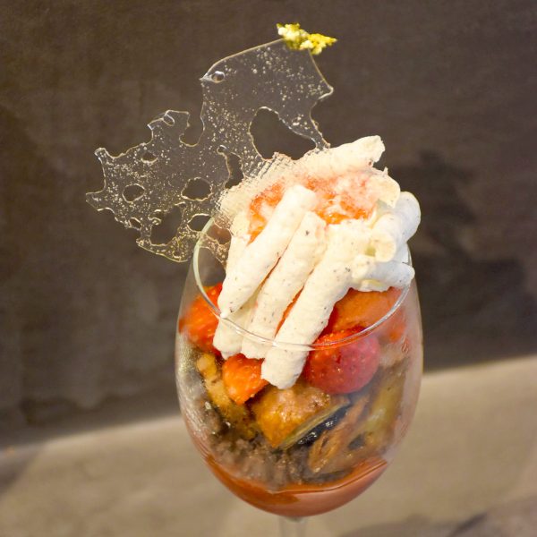 瑞々しいイチゴの香りに、濃厚なピスタチオを合わせたパルフェ。サクサクのパイ生地が食感のアクセントになっています。