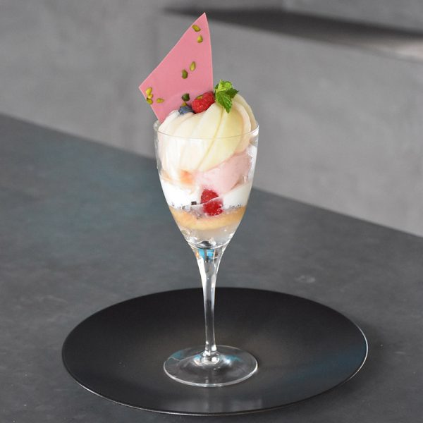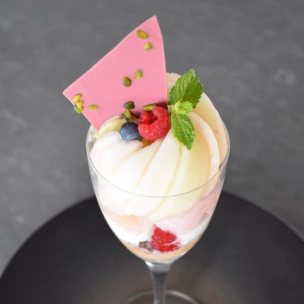 桃の風味が引き立つようにピスタチオと、ほのかに香るレモンのゼリーで構成しました。上品でやさしい味わいのパフェです。