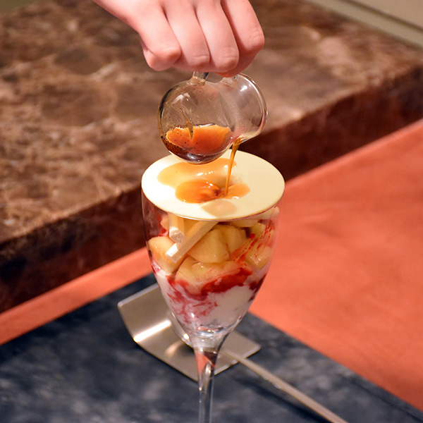 季節スイーツ ペッシュメルバ 桃と木苺を使ったデセール。美味しい桃が仕入れられる季節のみに提供しています。 桃の果肉、木苺のソース、ショコラクランブル、アクセントとしてトンカ豆のパンナコッタをグラスの底に。お客さまの手元で、温かいアールグレイのジュレでホワイトチョコレートを溶かし、仕上げていただきます。 PREV NEXT